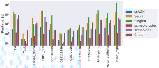 Finally, we compared the runtime complexity of our method against other scRNAseq classifiers. We ran all our methods on a 64-bit Ubuntu 18.04 machine with 256 GB of RAM and processor Intel Core i9-10900X CPU with a CPU cycle of 3.70 GH and 20 cores. In addition to that, the machine had an NVIDIA GeForce RTX 3090 graphics card with a graphics memory of 4096 MB. For simulated datasets containing 1000 cells and 800 genes, scAGN on average took 20 s to finish, while Seurat took 7 s, SingleR and Chetah each took 5 s, and scMAP-cell and scMAP-cluster each took roughly 1 s. From the analysis of the runtime complexity, we find that runtime increased with the number of cells and genes present in the dataset. For example, COVID-19 datasets were the largest ones and took the maximum time to finish the training and prediction. scAGN’s runtime complexity was the second lowest, with scMAP-cluster being the fastest method. Please note that the run-time estimate of scAGN is slightly higher due to the minimum 2000 steps that are used as early stopping criteria. In such a case, even if no improvement to training loss is made, training continues until 2000 steps have passed. A summary of the run time complexity of all methods is provided in Figure 10.