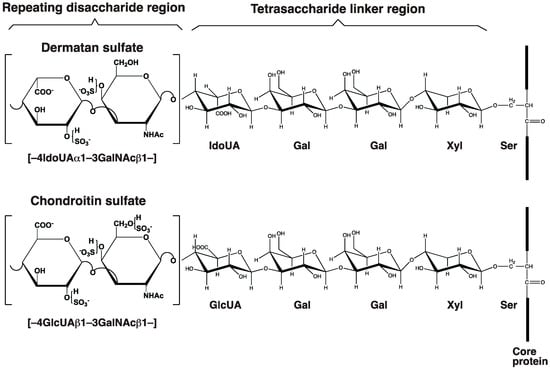 Dermatan sulfate (DS) is classified as a sulfated glycosaminoglycan (GAG) that is a linear polysaccharide chain, and it is covalently attached to the core proteins of proteoglycans (PGs) [1,2,3,4,5]. DS was first isolated from porcine skin by Karl Meyer in the 1940s [6]. DS-PGs have been purified from bovine tendon [7], bovine sclera [8], porcine skin [9], calf skin [10], and bovine periodontal ligament [11]. Two distinct populations of DS-PGs have been found in bovine sclera and cartilage [8,12]. A complete amino acid sequence of a DS-PG, decorin, has been deduced for human [13], bovine [14], chick [15], and rat [16] forms (Table 1). A complete amino acid sequence of another DS-PG, biglycan, has been identified for human [17] and bovine [18] forms. A DS-PG, PG-Lb/epiphycan, has been identified from chick embryonic epiphyseal cartilage [19]. Furthermore, a soluble DS-PG, endocan, has been isolated as an endothelial cell-specific molecule [20,21].