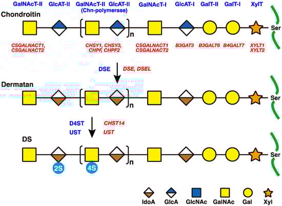 Biosynthetic pathway of DS side chain of PGs by diverse glycosyltransferases, epimerases, and sulfotransferases. Following the biosynthesis of core proteins (green), the common GAG-protein linker region, GlcUAβ1-3Galβ1-3Galβ1-4Xylβ1-, is constructed by XylT, GalT-I, GalT-II, and GlcAT-I on the specific Ser residue(s) of core proteins. After the formation of the linker region, chondroitin synthases build up the chondroitin backbone. Subsequently, the epimerization of GlcUA moieties as well as sulfation of mainly GalNAc and a small proportion of IdoUA residues are catalyzed by DSE as well as D4ST and UST, respectively. Each enzyme and its coding gene are indicated by blue and red characters, respectively.