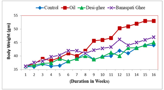 Among diet intervention groups, HFD-oil and HFD-banaspati ghee were seen to increase mice’s body weight substantially, and their long-term use can lead to obesity. Obesity-driven metabolic syndromes are linked with the development of type 2 diabetes, established on insulin resistance and cardiovascular disease [34,35].