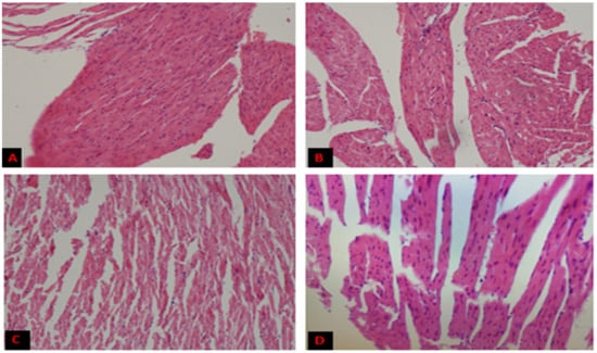 Histopathology of heart sections of mice. Representative sections from mice hearts from C-ND (A), HFD-DG (B), HFD-O (C), and HFD-BG (D).