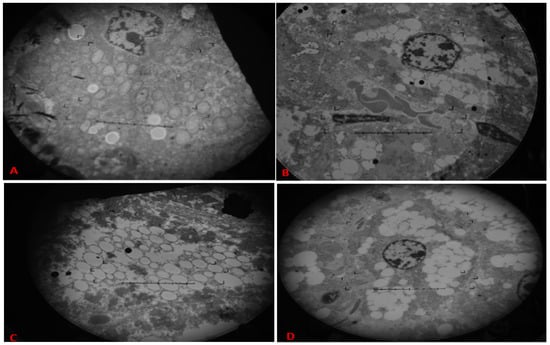 Liver sections were processed for imaging by transmission electron microscopy to see any pathological changes in the cellular architecture. Accumulation of lipids in the C-ND group was found to be normal. At the same time, there was a considerable accumulation of lipid droplets in the mice on the HFD-O and HFD-BG diet, compared to the HFD-DG group mice (Figure 4).