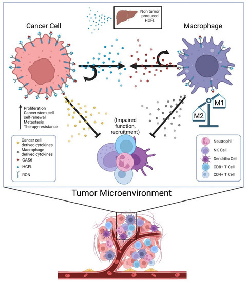 Cellular crosstalk of secreted factors in the tumor microenvironment (TME) that sustain high RON signaling in tumor cells and tumor-associated macrophages and alter the secretome to impair tumor immunogenicity. Physiologic sources of HGFL (primarily hepatocytes) provide a low level of HGFL for ligand activation, but tumor cells overexpress and produce high levels of HGFL to activate the abundant RON molecules on tumor cells in autocrine, and RON on the macrophages recruited to the TME. Tumor-associated macrophages secrete GAS6 providing its own means of RON activation on macrophages in autocrine and RON on tumor cells (and Axl where applicable). RON signaling in both tumor cells and tumor-associated macrophages alters the secretome of both cell types in manners that suppress innate and adaptive immune function, thus allowing for robust tumor growth.