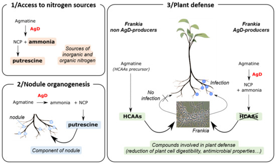 On the contrary, Frankia AgD producers would have the capability to degrade agmatine into NCP and ammonia; this degradation would prevent the production of HCAAs or strongly reduce HCAAS biosynthesis. In both cases, the decrease in HCAAs production allows the infection by Frankia and the subsequent formation of root nodules (Figure 2b).