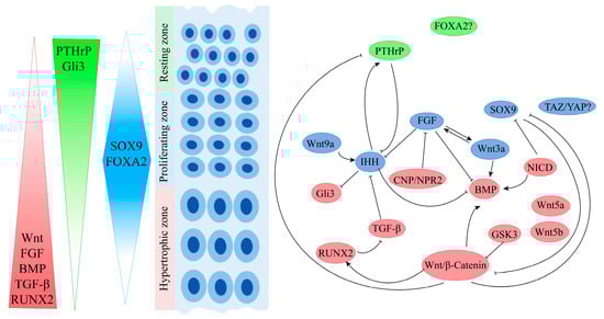 More information about the influences of biomechanical cues and systemically generated factors on the growth plate can be found in several recent review articles [12,33,34,35]. In addition to those systemic factors, several locally produced factors, including Ihh/PTHrP signaling, Notch signaling, BMPs, FGFs, TGF-B, and the Wnts, have previously been reported to play a pertinent role in the regulation of the formation and function of the growth plate, which is the focus of this review (Figure 3).