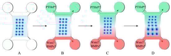 Although making scientific strides, current methods have not been able to make a complete growth plate. Given the critical role of the abovementioned pattern of distinct factors, from one end to the other, in maintaining the growth plate, a bioreactor with dual flow capacity can be a powerful tool when engineering this tissue. In Figure 4, we propose a developmentally informed method to generate a growth plate in vitro. Initially, the progenitors are loaded uniformly into a 3D-printed scaffold, where two mediums with different components are introduced, inducing cells to differentiate into chondrocytes. Due to the variety of signals received, these cells will mimic the varying phenotype of chondrocytes in the resting, proliferative, and hypertrophic zones of the native growth plate. If necessary, using elastic scaffolds and platforms will allow the extension of the growth plate.