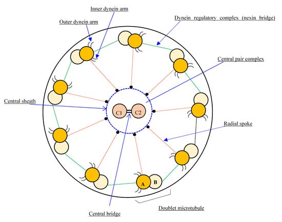 Cilia are responsible for various physiologic functions, including effective mucociliary clearance. The axoneme, or core of a cilium or flagellum, is an organized structure of microtubules with a 9 + 2 or 9 + 0 configuration, classified as motile or non-motile. Motile cilia with a 9 + 2 arrangement are found predominately in the upper and lower respiratory tracts, as well as in the female reproductive tract, whereas the flagellum is required for spermatozoa motility. A normal cilium has a circumference of nine microtubule doublets, with another pair in the center (central apparatus or central complex). Radial spoke proteins link the outer doublets to the center complex, and dynein and nexin proteins anchor them to one another (Figure 1 and Figure 2) [].