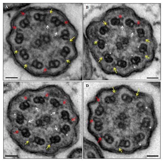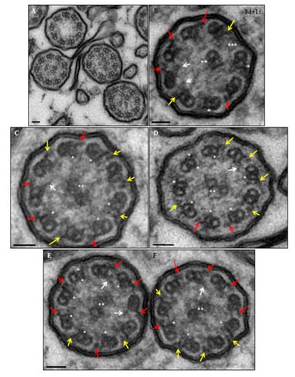 - Shoemark, A.; Boon, M.; Brochhausen, C.; Bukowy-Bieryllo, Z.; De Santi, M.M.; Goggin, P.; Griffin, P.; Hegele, R.G.; Hirst, R.A.; Leigh, M.W.; et al. International consensus guideline for reporting transmission electron microscopy results in the diagnosis of Primary Ciliary Dyskinesia (BEAT PCD TEM Criteria). Eur. Respir. J. 2020, 57, 1900725. [Google Scholar] [CrossRef]