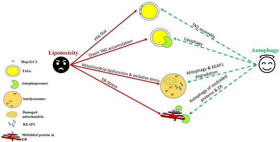 Autophagic induction in hepatocytes confers protection against lipotoxicity. As a cellular defense against nonesterified free fatty acid (FFA) flux, autophagy helps in their sequestration into triglycerides (TAGs). Lipophagy helps in TAG lipolysis, which helps in β-oxidation of stored lipids. Autophagy–lysosomal degradation of damaged mitochondria and KEAP1 helps to counter oxidative stress induced by saturated fats and their derivatives. Autophagy also helps to mitigate ER stress by degrading misfolded proteins and, in certain cases, a part of ER itself through a process termed “ER-phagy.”