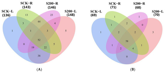 Expression values of conserved miRNAs and novel miRNAs in the roots and leaves of the four libraries. (A) The number of conserved miRNAs:SCK-L vs. S200-L;SCK-R vs. S200-R. (B) The number of novel miRNAs:SCK-L vs. S200-L;SCK-R vs. S200-R.
