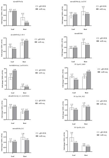 To verify the reliability of miRNA sequencing results and explore the expressive characteristics of miRNAs associated with salt tolerance, ten miRNAs with significant differences of expression levels in the roots and leaves were selected and analyzed using qRT–PCR. The expression levels of the following ten miRNAs under CK and salt stress conditions were determined: aly-miR393a-5p, aly-miR858-5p_L-1R+1, ath-miR162a-5p_L-1_2ss5GT6GA, bol-MIR9410-p3_2ss5TG18TA, mtr-miR166a_R-2, mtr-miR398a-3p_1ss21TC, nta-miR168d, PC-3p-613_8603, PC-3p-1384_3922, and PC-5p-838_6216. The results showed that except for PC-3p-613_8603, the expression patterns of the remaining nine miRNAs selected in qRT–PCR experiments were consistent with those detected via high-throughput sequencing (Figure 4). Most high-throughput sequencing results can be verified via qRT–PCR, indicating that the sequencing data were authentic and reliable.