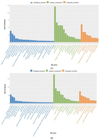 GO functional annotation of target genes between (A) leaves and (B) roots in Chrysanthemum. The x-axis represents the GO functional annotation. The y-axis represents the total number of targets annotated.