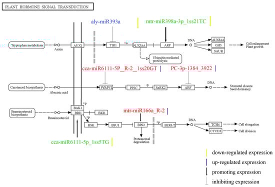 Combined with the miRNA expression profile, degradome and transcriptome data, the target genes and their pathways were analyzed for possible effects on salt stress. Significantly differentially expressed miRNAs were found in salt-stressed roots and leaves. Most pathways in which genes are located are associated with hormone signals during plant growth and development (Figure 8).
