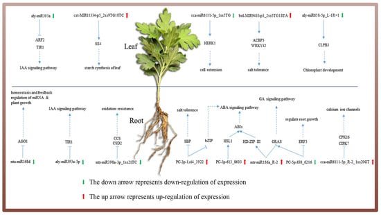 The potential regulatory system of miRNAs in ground-grown Chrysanthemum in response to salt stress. Green font represents significantly differentially expressed miRNAs in leaves, red font represents significantly differentially expressed miRNAs in roots, blue font represents significantly differentially expressed miRNAs in both roots and leaves.