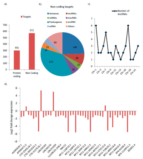 Figure 1. RNA sequencing results in GNE mutant cells compared wildtype overexpressing cells: (a) Coding and non-coding targets identified. (b) List of key non-coding targets identified (c) Chromosome specific distribution of lincRNAs. (d) Log2 fold change expression values of lincRNAs as per RNAseq data.