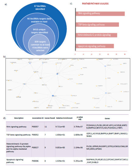 To predict the function of differentially expressed lincRNAs, all the 47 lincRNAs identified were selected for downstream target analysis. For this, lincRNAs were subjected to target prediction using rtool (http://rtools.cbrc.jp/cgi-bin/RNARNA/index.pl, accessed on 26 May 2021), using the minimum energy-based ranking method as the target selection criteria (Figure 2a). For each lincRNA, a maximum of the top 400 targets were selected for analysis, which finally led to the identification of a total of 8416 unique targets for 47 lincRNAs. To identify the most important targets, only the targets that were found to be regulated by more than or equal to four of the lincRNAs were shortlisted for downstream studies. This led to the identification of a total of 839 targets (Supplementary Table S4). Since transcription factors could specifically regulate lincRNA-associated genes, we first predicted various transcription factors that could be regulating these 839 target genes. Our analysis of potential factors using the Gencodis tool suggested a possible regulation by STAT1, SP1, TP53, and MYC transcription factors (Figure 2b). To identify the key genes with an important role, we next used panther analysis to find key pathways in which the lincRNA target genes were involved. Our study showed targets of the lincRNAs were part of essential processes of WNT signaling, TGF-β, and Apoptotic inducing pathways (Figure 2c,d); some of these pathways are well known to be important in various myopathies and dystrophies [29,30,31,32,33,34,35].