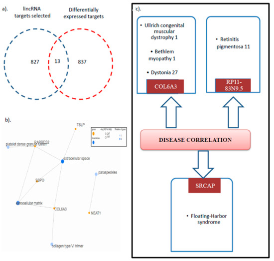 Figure 3. Identification of key targets: (a) Venn diagram to show common lincRNAs targets along with significant differential expression; (b) GO cellular compartment analysis of identified targets; (c) Medgen database supported disease association of crucial targets.