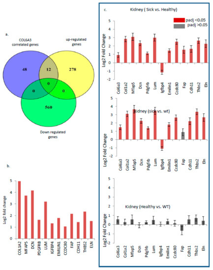 Figure 5. Analysis of COL6a3 correlated gene using various NGS data: (a) Venn diagram to show upregulation and downregulation status of COL6a3 co-expressed genes. (b) Log2 fold change expression of COL6a3 co-expressed genes (in RNAseq data). (c) Status of our COL6a3 and co-expressed 13 genes in HIBM specific diseased models in kidney tissue (GEO database GSE141302) in (i) Sick HIBM mice models vs. healthy mice (ii) Sick HIBM mice models vs wt mice, (iii) Healthy mice vs WT mice.