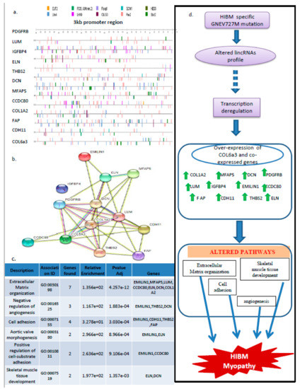 Further, to predict potential transcription factor binding sites that could be regulating this set of genes, we predicted key potential transcription factors (TFs) that could be binding at the promoter of these genes. For this, we used the CiiiDER tool and predicted TFs binding regions within 3000 bp upstream in COL6a3 and the coexpressed gene sets (Figure 7a). Interestingly, we found PAX2, STAT2, and LHX4 were among some of the key transcription factors whose binding sites were frequently present in most of these genes, thereby suggesting a possible co-regulated expression of these genes that requires further investigation. Additionally, string data analysis also suggested that the majority of these coexpressed targets could be interrelated and thus could be responsible for regulating crucial signaling molecules, leading to HIBM-specific pathological outcomes (Figure 7b). To elucidate their predictive role, GO biological pathways analysis was performed, which also showed the importance of these targets in important processes, including extracellular matrix organization, cell adhesion, and skeletal muscle tissue development (Figure 7c). Thus, we conclude that alteration of lincRNAs via V727M mutation could alter COL6a3-associated genes, thereby inducing the HIBM myopathy-associated phenotype, which may require further exploration.
