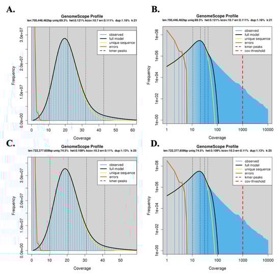 The K-mer size was estimated using JELLYFISH tool (http://www.cs.cmu.edu/~ckingsf/software/jellyfish/, accessed 29 January 2023) [33]. The results from this tool were used to estimate genome heterozygosity for PR by GenomeScope ver. 1.0 (https://github.com/schatzlab/genomescope, accessed on 30 January 2023) [34].