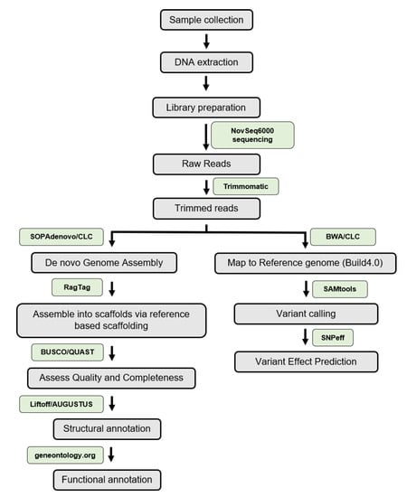 The workflow for reference guided assembly, annotation and variant calling used in this study. The major tools used have been highlighted in green boxes.