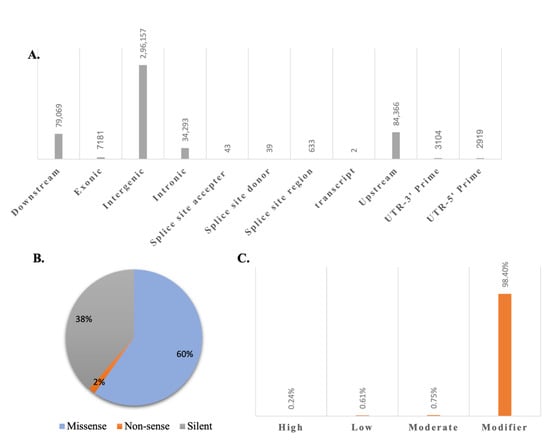Number of variants in S. lycopersicum cv. Pusa Ruby genome classified (A) based on genomic region in which they are present, (B) by functional class of effects (in percent), (C) by impact (in percent). Variants can be divided into 11 classes based on position in the genome. These include the following mutations along with their contribution in the Pusa ruby genome: 1. downstream of the gene (15.57%), 2. in the exonic region (1.41%), 3. in the intergenic region (58.32%), 4. in the intronic region (6.75%), 5. in the splice acceptor site (0.008%), 6. in the splice donor site (0.007%), 7. in the splice site (0.12%), 8. mutation hits a transcript (0.0003%), 9. Upstream of a gene (16.6%), 10. variant hits 3′ prime untranslated region (0.61%), and 11. variant hits 5′ prime UTR (0.57%). Based on functional class, the mutations can be missense, non-sense, or silent, the majority being missense (60%) here in the Pusa Ruby genome. (C) Based on impact, the variants can have a high, low, moderate, or no effect. The variants with no effect are defined as modifier here, which also account for the majority (98.4%).