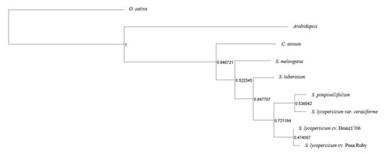 To analyze the functional relatedness of predicted PR genes with other Solanaceae crops, clustering of orthologous proteins was performed with orthofinder v2.5.4 tool (https://github.com/davidemms/OrthoFinder/releases/download/2.5.4/OrthoFinder.tar.gz, accessed on 10 June 2022) [51]. The protein sequences of Solanaceae species (Capsicum annum, S. lycopersicum, S. melongana, S. lycoeprsicum var. cerasiforme, S. pimpinellifolium and S. tuberosum) were downloaded from https://solgenomics.net/ (accessed on 8 June 2022). Arabidopsis and rice were used as outgroups. The phylogenetic tree based on orthologous was visualised using dendroscope v3.8.3.0 [52].