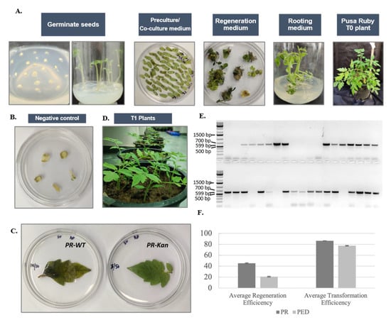 (A) Process of Agrobacterium tumefaciens mediated transformation of S. lycopersium var. Pusa Ruby and Pusa Early Dwarf. The image here represents Pusa Ruby only. (B) Explants not treated by Agrobacterium culture treated as control. (C) T1 transgenic plants growing in a greenhouse facility. (E) PCR and (D) kanamycin assay was used to select tranformants. Primers specific for kanamycin gene (nptII) were used for PCR that resulted in 599 bp long fragment. The PCR shown here is for one batch of plants with first two wells (1 and 2 in stack 1) with negative control wild type plants and 1 kb+ DNA ladder by Fisher scientific. (F) Regeneration and transformation efficiencies of Pusa Ruby (PR) and Pusa Early Dwarf (PED).