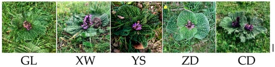 The wild materials of L. rotata used in this research were collected in Guoluo, Xiewu, Yushu, Zaduo, and Chengduo counties in Qinghai Province at different altitudes from 3750 m to 4270 m (Figure 1, Table 1). The root and leaf organs of L. rotata from the five areas were analyzed as experimental samples. The samples were placed in liquid nitrogen for rapid freezing and stored in a −80 °C ultra-low-temperature freezer for the following experiments.