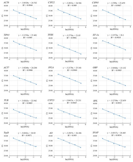 To check the efficiency of PCR amplification using these primers, the correlation coefficient (R2) of each primer set was determined using the slopes of the curves obtained by serial dilutions. For this purpose, a dilution series of template samples containing cDNA and water in the ratio of 1:1, 1:5, 1:25, 1:125, and 1:625 was prepared, and RT-qPCR was performed (Figure 2). The plot of the Ct values versus the natural logarithm (ln) of cDNA dilutions demonstrated a linear distribution for all primer sets (Figure 2). The calculation of R2 indicated that all primer sets had R2 values more than 0.95 (Figure 2). R2 values between 0.80 and 1.00 are considered very good for any primer set. The amplification efficiency (E) of the primers was between 90% and 114% (Table 2). Based on the values of E and R2, we concluded that the primer specificity of each candidate reference gene was strong and thus can be used for screening candidate reference genes.