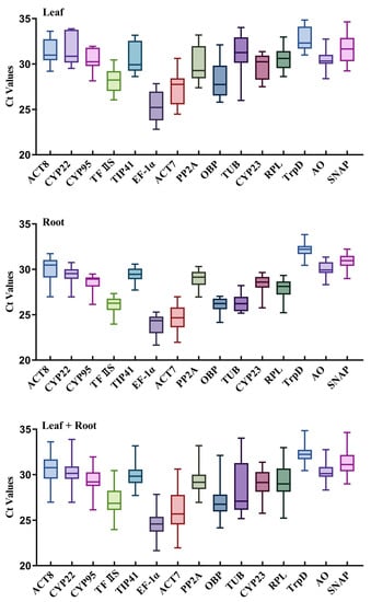 Gene expression levels of the candidate reference genes displayed as Ct values across leaf, root, and leaf + root samples of L. rotata from five habitats. The graph also shows the variation in Ct values for each reference gene. Whiskers across the box depict the highest and lowest values.