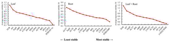Average expression stability (M value) of fifteen candidate reference genes based on geNorm analyses. The most stably expressed reference genes have the lowest M values. M values were calculated for leaf, root, and leaf + root tissues of L. rotata from five habitats. Genes with M values lower than 1.5 may be used as candidate reference genes.