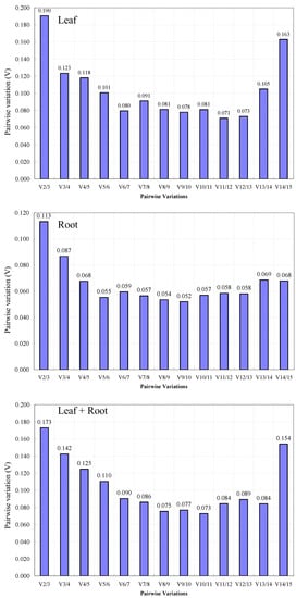 Through the GeNorm software, the 15 candidate reference genes were analyzed for the difference in candidate reference gene standardization factor pairs. The results (Figure 5) showed that V2/V3 was greater than 0.15 and V3/V4 was less than 0.15 in all samples and leaves from different regions. Therefore, three reference genes should be introduced in the RT-qPCR analysis of these two groups to make the results accurate and reliable. However, in the roots of L. rotata from different regions, V2/V3 (0.113) < 0.15, which indicated that the two internal reference genes can make the analysis accurate and reliable when RT-qPCR analysis was carried out in this group.