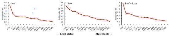 The stability of the 15 candidate reference genes was analyzed using NormFinder software. Similar to GeNorm, the lower the value is, the stronger the stability of genes is. In Figure 6, the stability sequencing results of different candidate reference genes in three different tissues were listed from left to right. In leaves from different regions, TFIIS had the best stability (0.22), whereas TUB had the worst stability (1.43). In the roots of L. rotata from different regions, the stability of OBP was the best (0.13), whereas the stability of TrpD was the worst (0.67). CYP22 and TFIIS were stable in the top four in all experimental conditions and could be considered the best candidate reference genes. By contrast, TUB and TrpD had poor stability under all experimental conditions.