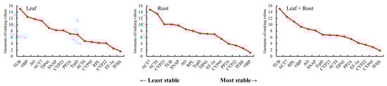 BestKeeper is an Excel-based algorithm, which directly uses the Ct value obtained from RT-qPCR analysis for further analysis. BestKeeper evaluates the stability of the candidate reference gene by calculating its CV and SD. Smaller CV and SD values represent better stability. From Table 4, in the leaves the stability of OBP (6.57 ± 1.86) was the worst, whereas that of TrpD (2.84 ± 0.92) and CYP95 (3.51 ± 1.07) was the best In the roots from different regions, the stability of ACT7 (4.39 ± 1.08) was the worst, whereas that of TrpD (1.58 ± 0.51) and AO (1.65 ± 0.50) was the best. Under all experimental conditions, the stability of TrpD ranked first, and it was considered the most suitable reference gene.