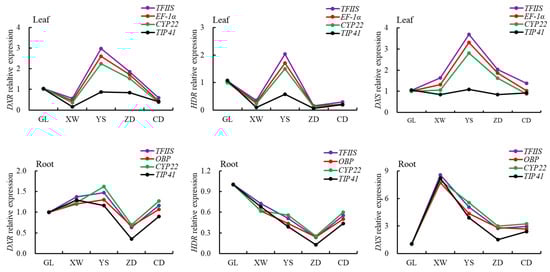 In order to further verify the selected internal reference genes from the screen, we selected DXR, DXS, and HDR as the target genes. DXR, DXS, and HDR are key functional genes in the biosynthetic pathway of iridoid compounds and play roles in regulating the accumulation of downstream products and influencing the biosynthesis of iridoid compounds [,,]. For example, the overexpression of the DXR gene induced by MeJ in Tripterygium wilfordii can increase the accumulation of triptophenolide []. Overexpression of the DXS2 gene in the hairy root of Salvia miltiorrhiza will increase the content of tanshinone, while down-regulation of the DXS2 gene will significantly reduce the content of tanshinone []. Overexpression of the HDR gene in Nicotiana tabacum will cause the expression of downstream genes related to terpene biosynthesis to be up-regulated, thus causing a significant increase in the accumulation of terpene compounds []. In this study, the expression levels of three target genes mentioned above were analyzed using the three most stable internal reference genes and one less stable internal reference gene. The results showed that the expression pattern of a same target gene (DXR, DXS, or HDR) was very similar although using the three most stable reference genes (TFIIS, EF-1α, or CYP22 in leaves) (Figure 8), while the expression pattern of a same target gene (DXR, DXS, or HDR) changed more or less using a less internal reference gene (TIP41) (Figure 8). The validation results further illustrated the reliability of the ReFinder analysis results, and our study results also showed the importance of selecting the appropriate internal reference genes to ensure the reliability of RT-qPCR results.