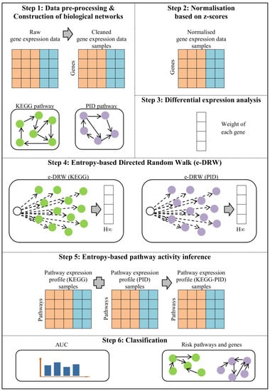 The integration of microarray technologies and machine learning methods has become popular in predicting the pathological condition of diseases and discovering risk genes. Traditional microarray analysis considers pathways as a simple gene set, treating all genes in the pathway identically while ignoring the pathway network’s structure information. This study proposed an entropy-based directed random walk (e-DRW) method to infer pathway activities. Two enhancements from the conventional DRW were conducted, which are (1) to increase the coverage of human pathway information by constructing two inputting networks for pathway activity inference, and (2) to enhance the gene-weighting method in DRW by incorporating correlation coefficient values and t-test statistic scores. To test the objectives, gene expression datasets were used as input datasets while the pathway datasets were used as reference datasets to build two directed graphs. The within-dataset experiments indicated that e-DRW method demonstrated robust and superior performance in terms of classification accuracy and robustness of the predicted risk-active pathways compared to the other methods. In conclusion, the results revealed that e-DRW not only improved the prediction performance, but also effectively extracted topologically important pathways and genes that were specifically related to the corresponding cancer types.