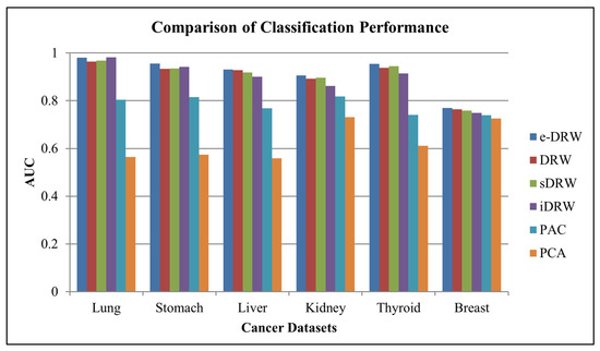 Based on Figure 2, the proposed e-DRW method obtained mean AUCs of 0.980374 for the lung cancer dataset, 0.955072 for the stomach cancer dataset, 0.931034 for the liver cancer dataset, 0.906522 for the kidney cancer dataset, 0.954286 for the thyroid cancer dataset, and 0.769068 for the breast cancer dataset. By comparing the mean AUCs with other methods, e-DRW achieved the highest mean AUCs across all datasets, except for the lung cancer dataset, which was slightly lower than the iDRW (0.981259) method. This indicates that e-DRW-based pathway markers are quite competent in discriminating between different disease phenotypes. It also demonstrated the best overall classification performance on the within-dataset experiments when compared with other methods.