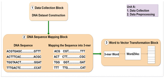 A DNA sequence is represented as a fixed length of feature vectors which can be classified by deep learning algorithms. We used the K-mer approach to break the genomic sequence into fixed-length words (3-mer). It is a standard feature encoding algorithm widely used in various prediction tasks. When K = 2, we call this method dinucleotide composition (DNC), and when K = 3, we call this method trinucleotide composition (TNC). In this study, we have used K = 3. Trinucleotide composition in K-mers is commonly used to predict DNA N4-methylcytosine (4mC) using deep learning approaches, because 4mC modification tends to occur in specific patterns within DNA sequences, and these patterns are often related to the surrounding trinucleotide context of the 4mC site. In K-mer analysis, the K-mer size is the length of the substring that is extracted from the DNA sequence for analysis. Trinucleotide composition specifically refers to K-mers of length 3, where the substring consists of three adjacent nucleotides. By using trinucleotide composition in K-mers of length 3, we can capture information about the surrounding nucleotides in a DNA sequence that are most relevant for predicting 4mC modification. This is because the presence of 4mC is known to be influenced by the nucleotides that immediately precede and follow the modification site. Therefore, analyzing trinucleotide composition allows the model to capture these important contextual features in the data. In addition, using trinucleotide composition in K-mers of length 3 also reduces the total number of K-mers that need to be considered in the analysis, compared to using larger K-mer sizes. This can improve the efficiency of the analysis and reduce the computational requirements for training the deep learning model. In TNC, all samples of 41 nt produce 39 components with the equation of L − k + 1. Here, L stands for the sequence length, and k stands for the K-mer value as an integer [11,12,13,14,15,16,17,18,19,20,21,22,23,24]. ATG, TGC, GCG, and CGA are the four 3-mers that can be tokenized from the DNA sequence “ATGCGA,” for instance.