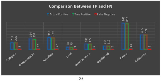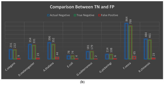 True positive and true negative are represented as TP and TN in Figure 2a,b above, with the correct number of identified sequences related to 4mC and non-4mC, respectively. False positive and false negative denoted are as FP and FN, respectively, and indicate the false number of identified sequences for 4mC and non-4mC. We have split each dataset 80:20, where 80% is the training set and 20% is the testing set. The total number of 4mC sites correctly identified by this proposed model for C. elegans, D. melanogaster, A. thaliana, E. coli, G. subterraneus, G. pickeringi, F. vesca, and R. chinensis datasets are 226 out of 231, 337 out of 354, 379 out of 396, 75 out of 78, 177 out of 182, 112 out of 114, 852 out of 865, and 476 out of 485, respectively. The non-4mC sites correctly identified by this proposed model for the same datasets are 222 out of 231, 331 out of 354, 352 out of 396, 74 out of 78, 179 out of 181, 108 out of 114, 799 out of 864, and 461 out of 484, respectively.