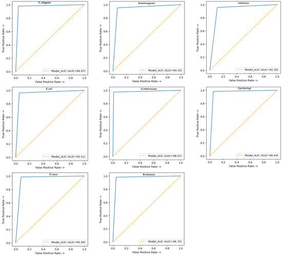 In Figure 3, the blue dots represent the True Positive Rate (TPR) at different classification thresholds, while the orange dots represent the AUC of this proposed model. The proposed model obtained AUC values of 96.97, 94.35, 92.30, 95.51, 98.07, 96.49, 95.49, and 96.70 for the C. elegans, D. melanogaster, A. thaliana, E. coli, G. subterraneus, G. pickeringi, F. vesca, and R. chinensis datasets, respectively. That is, the proposed model has 96.97%, 94.35%, 92.30%, 95.51%, 98.07%, 96.49%, 95.49%, and 96.70% probability of distinguishing 4mC from non-4mC for each dataset, respectively. The results of other performance evaluation matrices are shown in Table 6.