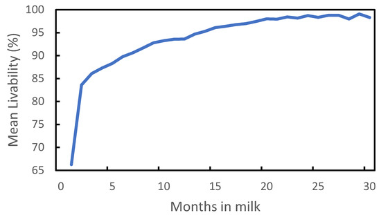Mean LIV in data set 1 as a function of months in milk is plotted in Figure 3. For cows with <1 month in milk, mean LIV was 66% and increased to 90% for cows with >6 months in milk, and reached 98% after 21 months in milk. Although 10 months is generally considered the optimal lactation length, 10% of the cows had >18 months in milk. Miller et al. [7] found similar results with respect to the relationship between days in milk and death rate, but did not differentiate between cows with >251 days in milk.