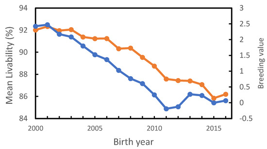 Mean LIV scores and breeding values of the cows in data set 5 by birth year are given in Figure 4. The genetic base was set so that the mean of cows born in 2015 would equal zero. Mean LIV declined by 6% for cows born in 2016 compared to cows born in 2000; and mean breeding values declined by 2.5% for cows born in 2011 compared to cows born in 2001. Since 2012, there has been a slight increase in mean breeding values. This may be due to the fact that only cows with exit dates were included in the analysis, and the cows born in the last few years may be a biased sample. Phenotypic and genetic regressions for LIV over the 14-year period from 2000 to 2013 were −0.42 and −0.22 per year. Subtracting the genetic from the phenotypic regression gives an environmental regression of −0.20%/year.