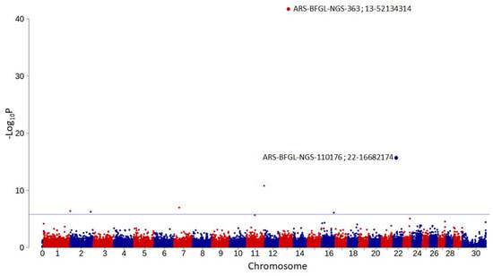Manhattan plot for livability. The markers’ chromosomal positions, annotated on the ARS-UCD1.2 genome assembly, are on the x-axis, and the nominal −log10 p-values are on the y-axis. Chromosome 0 denotes markers with unknown map positions, and chromosome 30 is the sex chromosome. The blue horizontal line indicates the genome-wide significance threshold of p = 0.05 after correction for multiple testing. The marker labels and map positions for the two markers with the lowest nominal p-values are listed.