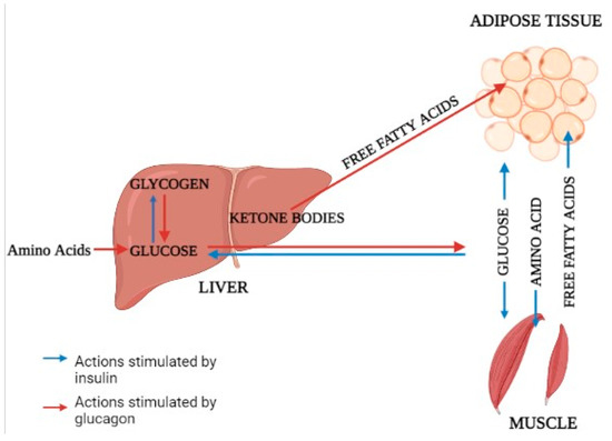 The majority of total glucose disposal happens in insulin-independent tissues, with roughly 50% occurring in the brain and 25% occurring in the splanchnic region (liver and the gastrointestinal tissues) [36]. The release of glucose from the liver closely matches glucose use, which averages around 2.0 mg/kg/min [37]. The majority of glucose elimination in the body happens in muscle tissue after consuming a glucose-containing meal [38]. Glucose homeostasis is dependent on three interconnected processes: pancreatic insulin secretion, stimulation of glucose uptake by splanchnic (liver) and peripheral tissues, and inhibition of hepatic glucose output [39]. Adipose tissue accounts for only 4%–5% of total body glucose elimination, which plays a critical role in maintaining whole body glucose homeostasis [40]. Pathways involved in liver metabolism related to muscles and adipose tissue are also mentioned (Figure 1).