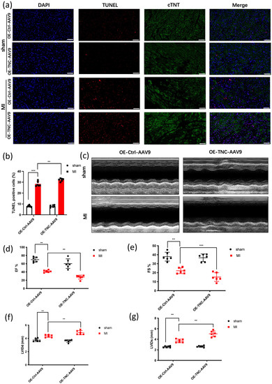 Overexpression of TNC leads to cardiac dysfunction and cardiac fibrosis. (a,b). Cell death in tissue samples was characterized by TUNEL assay, scar bar: 50 um, (n = 6); (c–g). Representative photographs of M-mode echocardiography. Quantitative analysis of echocardiography. FS, fractional shortening; EF, ejection fraction; LVIDd, left ventricular internal diameter end-diastolic: suggests that the size of the left ventricle is usually related to the impairment of cardiac function; LVIDs, left ventricular internal diameter end-systolic: reflects the size of the ventricle at the end of cardiac contraction (n = 6); (h) Masson Trichrome staining and HE staining of heart tissue sections 28 days post-ligation, scar bar: 100 um, (n = 6); (i) statistical analysis of the fibrosis in Figure 1h (n = 6). ** p < 0.01, *** p < 0.001.