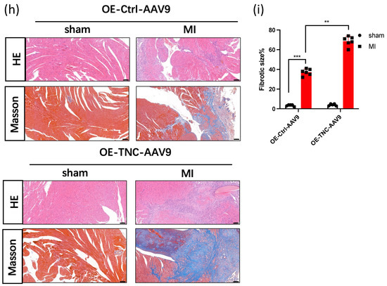 To demonstrate the effect of TNC on cardiac function, we injected OE-TNC-AAV9 into the myocardium before we established the MI model. After 3 weeks, we established the animal model. Next, TUNEL staining showed more apoptosis cardiomyocytes in OE-TNC-AAV9-injected mice after MI 1 week (Figure 1a,b). The echocardiography was used to analyze LVEF and LVIDs in each group (Figure 1c). The data showed a significant reduction in LVEF and FS% in OE-TNC mice (Figure 1d,e), with an increase in LVIDd and LVIDs (Figure 1f,g). Moreover, Masson’s Trichrome staining showed more fibrosis in OE-TNC mice (Figure 1h,i). The HE staining showed that cardiomyocytes were arranged in an orderly manner, with rich and even cytoplasm and normal stroma in the WT group, compared with the OE-TNC group (Figure 1h). The results showed TNC promoted cardiac dysfunction and cardiac fibrosis after MI.