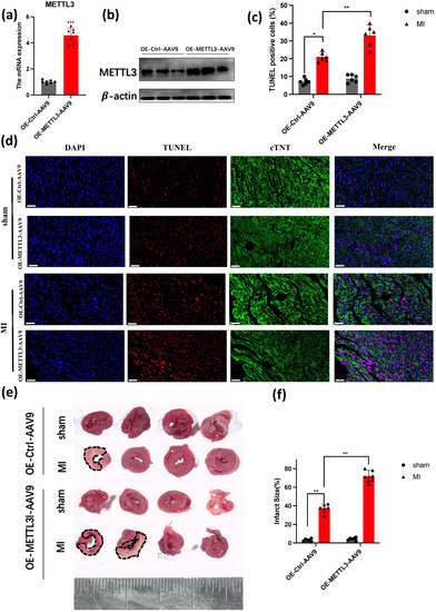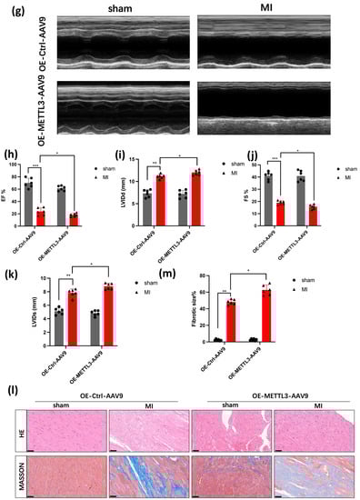 In order to determine the effect of METTL3 on cardiac function, we also injected OE-METTL3-AAV9 into the myocardium before we conducted the MI model, after MI 3 weeks (Figure 2a,b). Next, we investigated the apoptosis levels of OE-METTL3 and WT after MI 1 week, and we observed an increased level of apoptosis in TUNEL (Figure 2c,d). We also used TTC staining to analyze the infarct size. TTC is a mitochondrial proton pump coupling agent, which can be coupled with the mitochondrial proton pump of fresh myocardial cells for staining. The red area is the living myocardial tissue, and the white area is the infarcted myocardial tissue. The TTC staining demonstrated that more infarct size, circled by black dotted lines, in OE-METTL3 (Figure 2e,f). Then the echocardiography was used to analyze LVEF and LVIDs in OE-METTL3 and WT mice (Figure 2g). It showed a significant reduction in LVEF and FS% in OE-METTL3 mice (Figure 2h,i), with an increase in LVIDs and LVIDs (Figure 2j,k). Moreover, Masson’s Trichrome staining showed more fibrosis in OE-METTL3 mice and HE staining showed that cardiomyocytes were also arranged orderly in the OE-METTL3 group, compared with the WT group (Figure 2l,m). It showed that METTL3 led to the deterioration of cardiac function.
