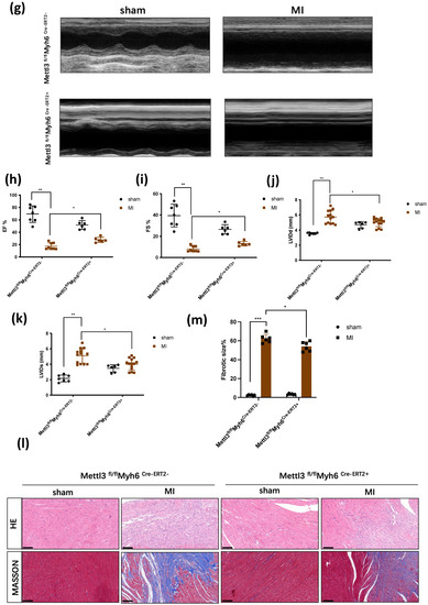 In order to demonstrate the effect of METTL3 when absent, we constructed mice with cardiac METTL3-specific knockout (Figure 3a,b). We examined the apoptosis level and found less TUNEL marker compared with WT mice after 1 week of MI (Figure 3c,d). Similarly, the TTC staining demonstrated less infarct size when METTL3 was knockout, which was circled by black dotted lines (Figure 3e,f). The effect of METTL3 on LV pump function and geometry was analyzed by echocardiography in WT and CKO-METTL3 mice 4 weeks after MI (Figure 3g). CKO-METTL3 mice showed less reduction in LVEF after MI, compared with WT mice (Figure 3h,i). What’s more, CKO-METTL3 mice showed a significant decrease in LVIDs (Figure 3j,k). Those data clearly exhibited that METTL3 deficiency led to a marked increase in LV function, as well as the enlargement of LV. Then we analyzed whether CKO-METTL3 affected myocardial fibrosis. From the results, Masson’s Trichrome staining demonstrated more fibrosis in WT mice compared with CKO-METLL3 mice after MI (Figure 3l,m), which showed that METTL3 deficiency reduced myocardial fibrosis. Moreover, HE staining showed that cardiomyocytes were also arranged disorderly in the WT group, compared with the METTL3 deficiency group (Figure 3l). Those results suggested cardiac dysfunction and cardiac fibrosis were attenuated without METTL3.