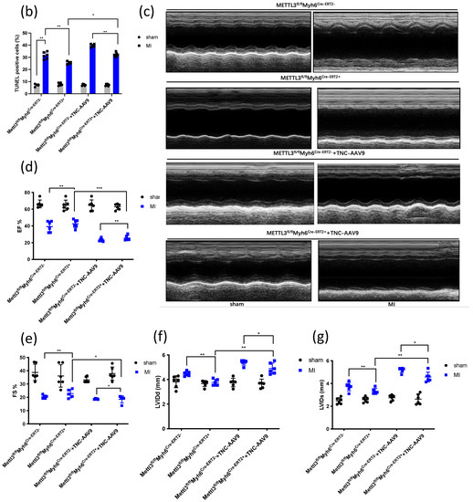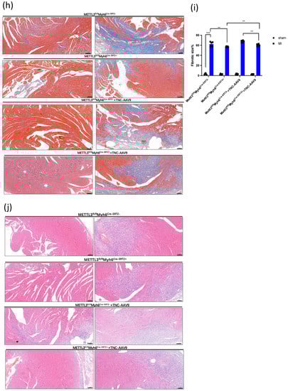 To demonstrate whether TNC contributed to cardiac dysfunction was regulated by METTL3, we injected OE-TNC-AAV9 into the myocardium of CKO-METTL3 mice, and 3 weeks later we conducted the MI model. TUNEL staining showed that there was more apoptosis myocardial in CKO-METTL3 mice injected with OE-TNC-AAV9 compared with that in CKO-METTL3 mice without OE-TNC-AAV9 injection (Figure 4a,b). Then the echocardiography was again used to analyze LVEF and LVIDs in each group (Figure 4c). It showed a significant reduction in LVEF and FS% in CKO-METTL3 mice injected with OE-TNC-AAV9 (Figure 4d,e), with an increase in LVIDd and LVIDs (Figure 4f,g). Moreover, Masson’s Trichrome staining showed more fibrosis in CKO-METTL3 mice injected with OE-TNC-AAV9 (Figure 4h,i). Similarly, HE staining showed more disordered cardiomyocytes (Figure 4j). The results showed TNC overexpression in CKO-METTL3 mice greatly led to cardiac dysfunction.